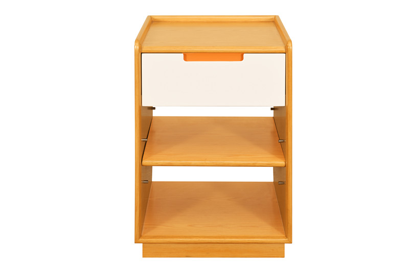床頭柜 基材:為實(shí)木白蠟?zāi)究蚣芙Y(jié)構(gòu),臺(tái)面多層板貼白蠟?zāi)酒ぁ?三面起安全圍邊,防止物品易傾倒跌落,接觸面安全圓角,減低碰撞傷害,條狀暗拉手,抽面板用不同的色彩,是為了突出不同的作用
