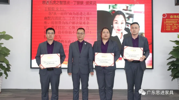 2020年,您創建了思進家具“集采系統”,雙軌采購制度,為公司創造了直接利潤,節省了采購成本,并且可以持續運行,同時,為公司贏得良好的社會聲譽!多年的忠誠工作,必然春風化雨,得威獲望!鑒于此,您被評選為思進品牌“中流砥柱”榮譽稱號!望在未來的日子,繼續發揮所長,為公司創造更高的價值!